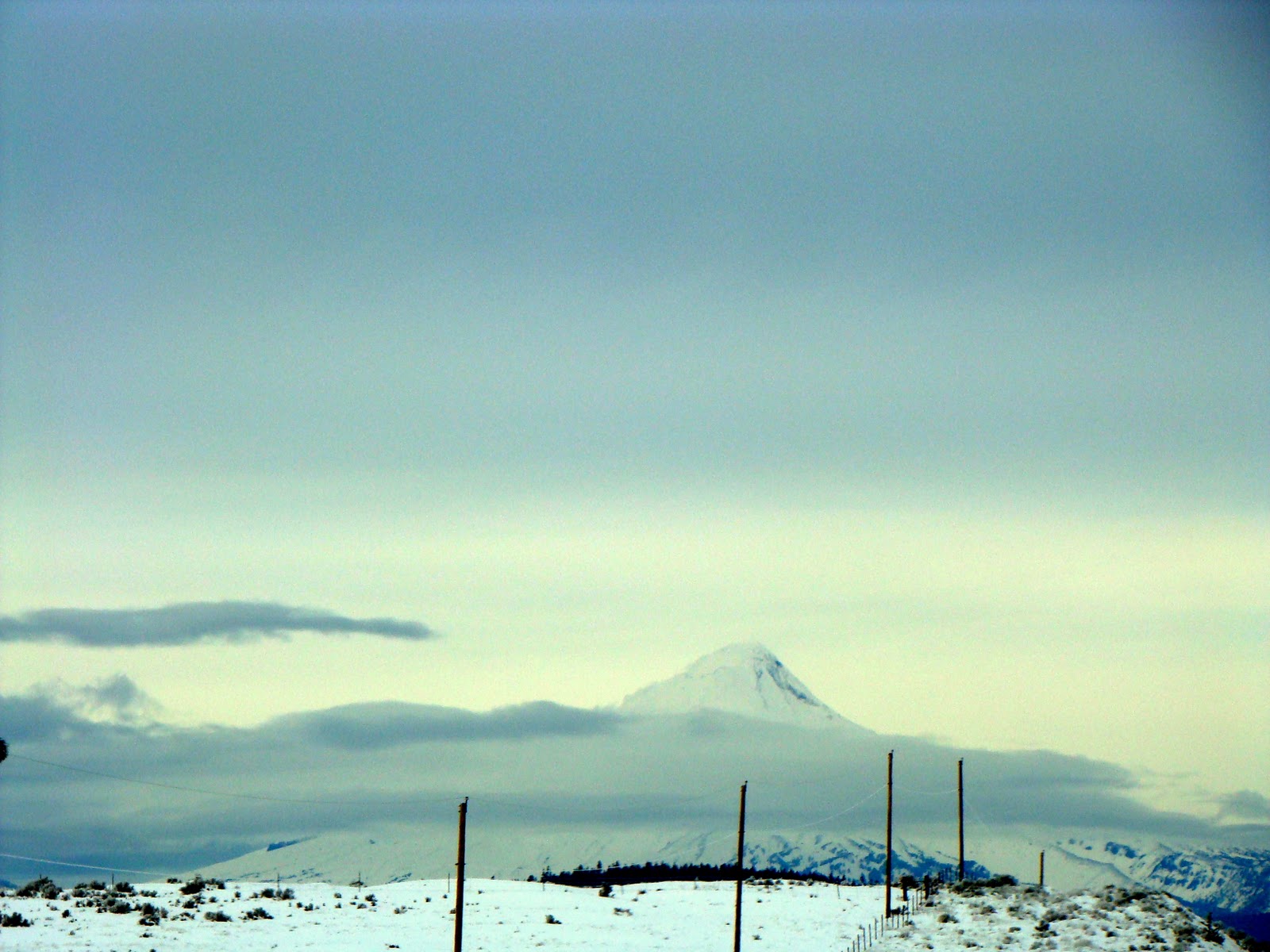 FYI: It is really difficult to get a good shot of Mt. Hood from the passenger seat, with your hand out the window driving along on curves. Still, you can see a bit of the mountain: